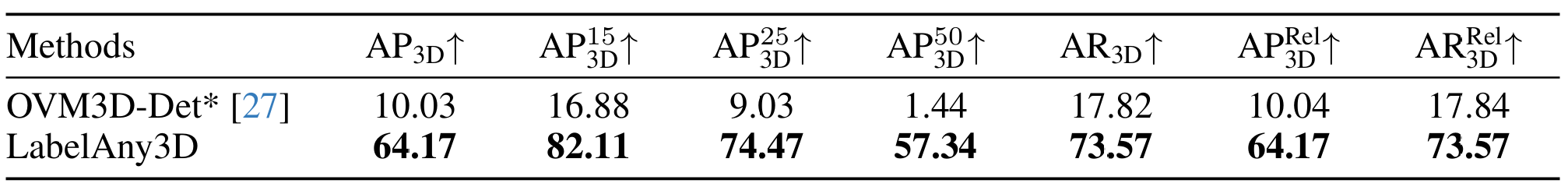 - 我们证明了 LabelAny3D 生成的 3D 标注持续改善了单目 3D 检测性能,超越了现有的自动标注方法。