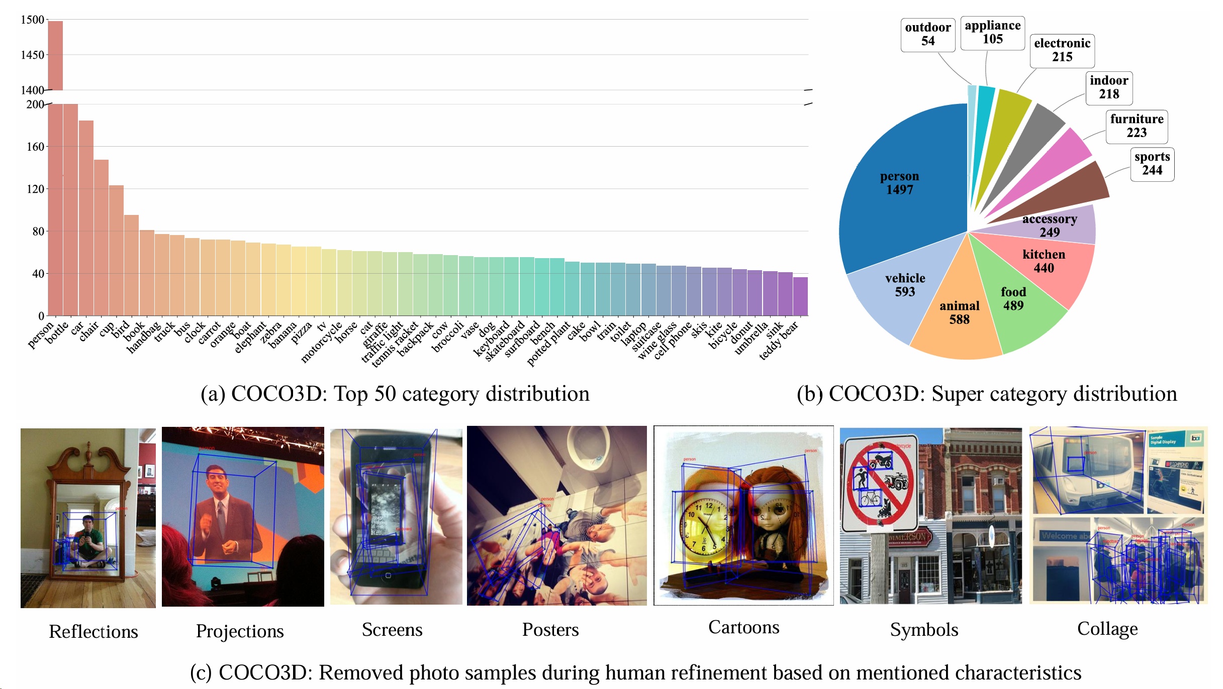 图 4:COCO3D 基准测试。(a) COCO3D 基准测试中前 50 个类别的分布。(b) COCO3D 基准测试中基于 MS-COCO [40] 的超类别分布。(c) 在人工细化过程中从 COCO3D 中移除的样本示例。