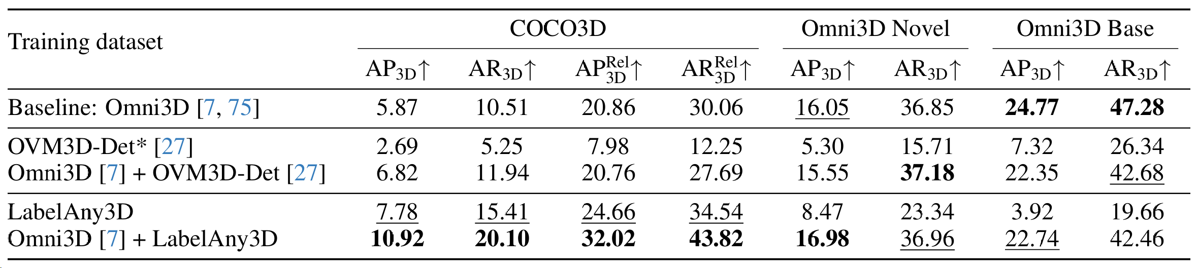 表 1:不同训练设置下 OVMono3D [75] 的性能。我们在我们的 COCO3D 基准测试以及 OVMono3D 评估中的 Omni3D 新类别和基础类别分割上报告分数。每个指标的最佳结果以**粗体**突出显示。次佳结果带下划线。"Rel" 表示相对布局指标。† 表示模型使用预训练的 OVMono3D 初始化。