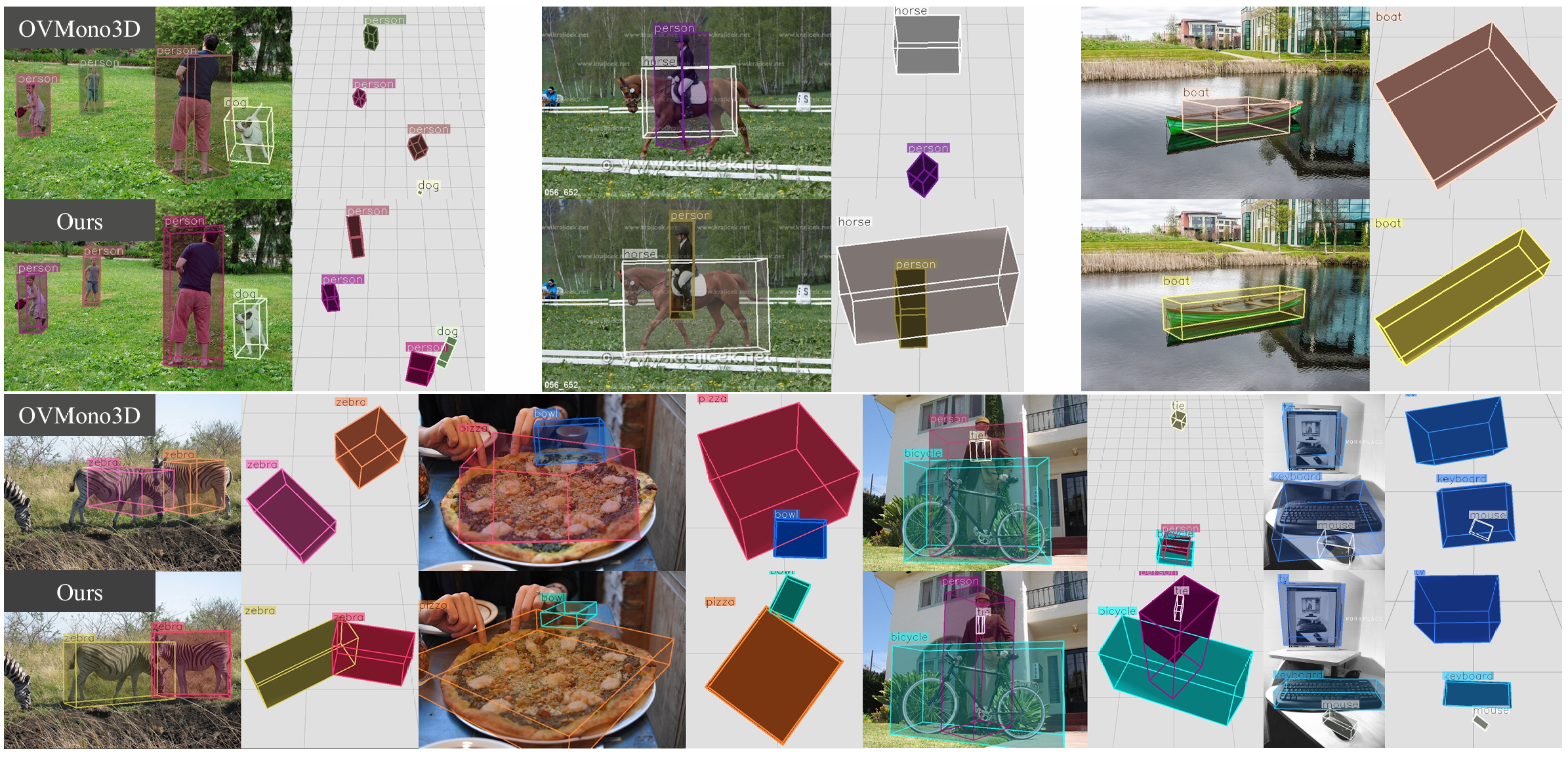图 5 展示了 COCO3D 上的定性示例。与基线模型相比,我们微调的 OVMono3D 在不同场景中表现出更强的检测鲁棒性,特别是对于现有数据集中代表性不足的新物体类别,例如动物、披萨、领带、船。