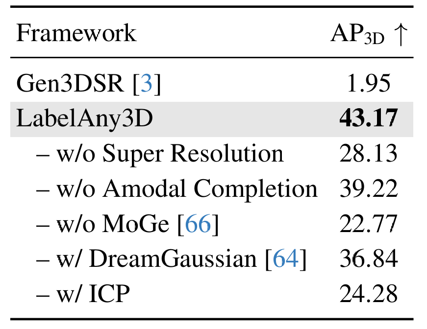 LabelAny3D 组件的消融实验 。我们在 COCO3D 数据集的一个子集上进行了消融实验,并在表 3 中报告了标注质量。原始 3D 场景重建模型 Gen3DSR [3] 的 AP3D\mathrm{AP}{3\mathrm{D}}AP3D 仅为 1.95。相比之下,我们完整的 LabelAny3D 流程实现了更高的 AP3D\mathrm{AP}{3\mathrm{D}}AP3D 43.17。这个结果表明我们的流程为 3D 框标注提供了更好的 3D 重建。移除图像超分辨率模块导致大幅下降至 28.13 AP3D28.13\ \mathrm{AP}{3\mathrm{D}}28.13 AP3D,突显了其在增强小物体和远处物体细节方面的重要性。消除非模态补全也会降低性能,显示了其在减轻遮挡负面影响方面的作用。用 Depth Pro 单独替代 MoGe 的相对深度(缩放到匹配 Depth Pro)会导致性能显著下降,表明 MoGe 提供了更准确和可靠的相对深度。对于 3D 重建,使用 TRELLIS [72] 比使用 DreamGaussian [64] 提高了 6.33 点的 AP3D\mathrm{AP}{3\mathrm{D}}AP3D,表明 TRELLIS 产生更真实和更高保真度的重建。为了将重建的物体与图像点云对齐,我们比较了迭代最近点(ICP)与我们使用的 2D 匹配 + 透视-n-点(PnP)方法。后者产生了优越的结果,主要归功于底层 2D 匹配模型的鲁棒性。
