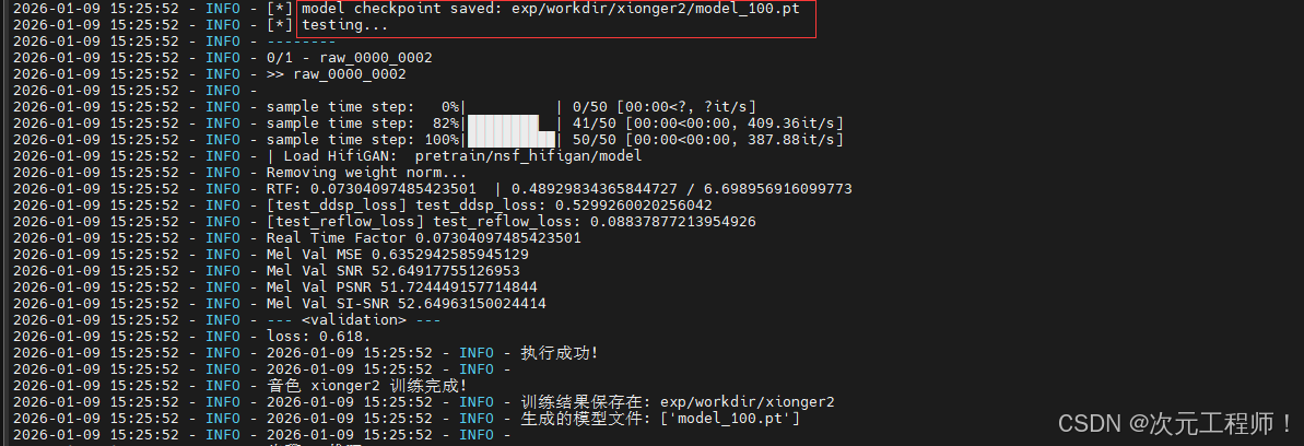 - 判定:该值 0.088 → ✅【极佳】,该损失值 < 0.2 为合格,< 0.1 为优秀,看到我的数值已经接近 0,说明模型的流匹配效果拉满,合成的音频会非常贴合原声