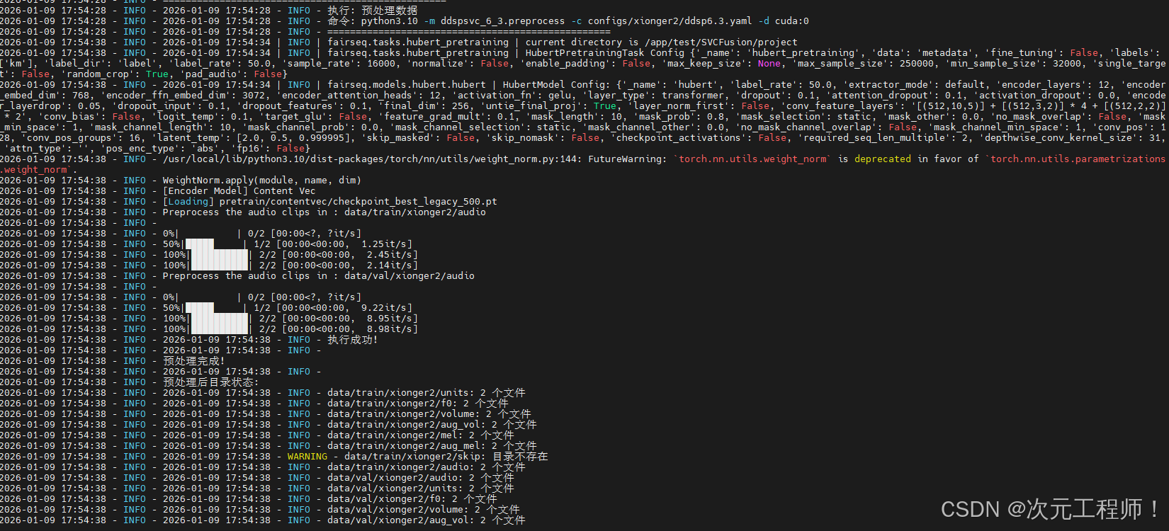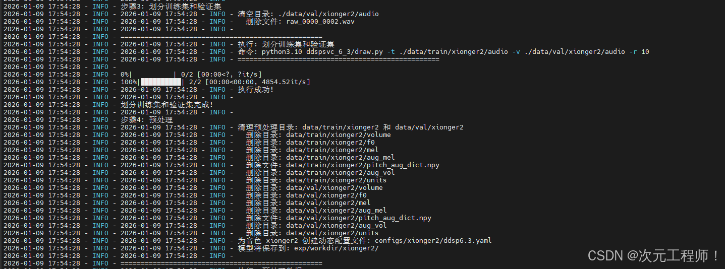 但是带有UI界面的整合包,合成的效果很快,效果也很好。因此我从整合包界面开始,深扒背后执行的源码,py脚本文件,然后再总结脚本的作用,执行命令,梳理出了一套基于SVC整合包的DDSP-SVC6.3的音色克隆流程 ,该模型在一张NVIDIA A100-SXM4显卡,80GB显存的情况下,只需要1分钟(训练100steps)即可生成非常好的效果。 整合包里面我拿我自己的也试过(RTX 4070ti,16GB显存),差不多2分钟左右也很快。