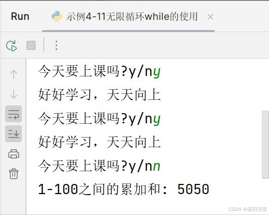 python# 【示例4-11】 i = 1 # (1) 初始化变量 s = 0 while i <= 100: # (2) 条件判断 s += i # (3) 语句块 i += 1 # (4) 改变变量(关键!) print('1-100之间的累加和:', s)