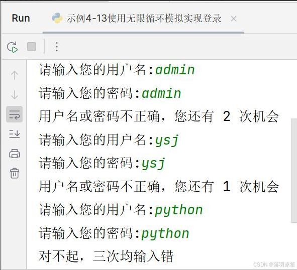这是实际开发中非常常见的逻辑:限制尝试次数。python# 【示例4-13】 i = 0 while i < 3: user_name = input('请输入您的用户名:') pwd = input('请输入您的密码:') if user_name == 'ysj' and pwd == '888888': print('系统正在登录,请稍后') break # 登录成功直接退出 else: if i < 2: print('用户名或密码不正确,您还有', 2-i, '次机会') i += 1 if i == 3: print('对不起,三次均输入错')