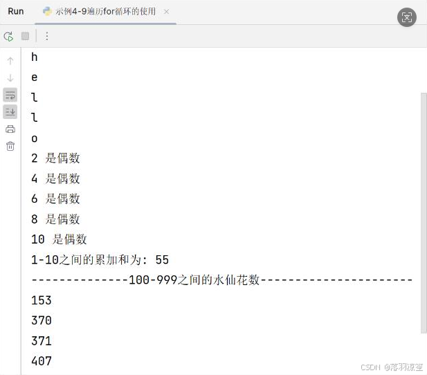 我们先来看最简单的例子,遍历字符串中的每一个字符。python# 【示例4-9】 for i in 'hello': print(i) -