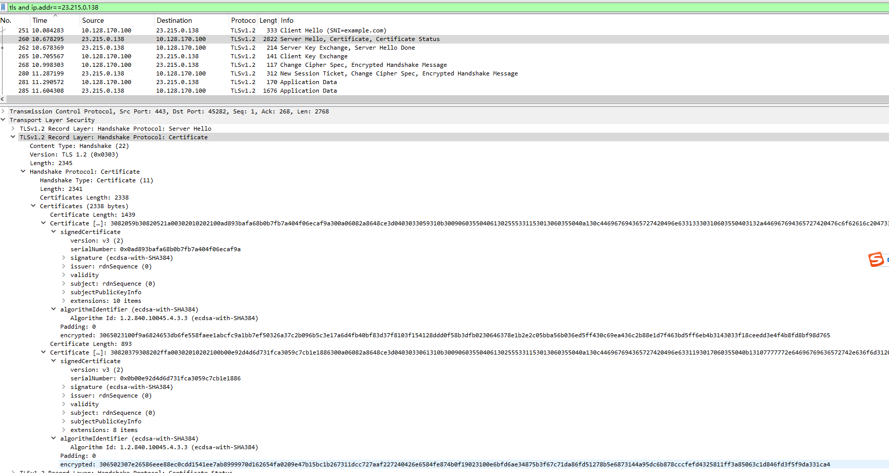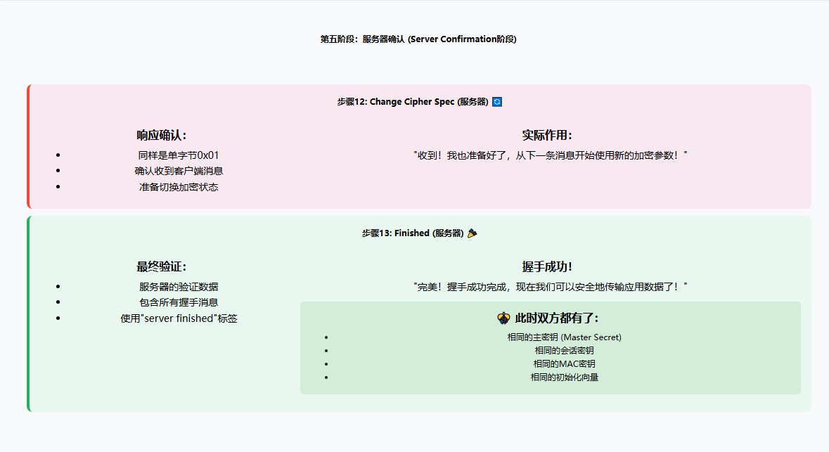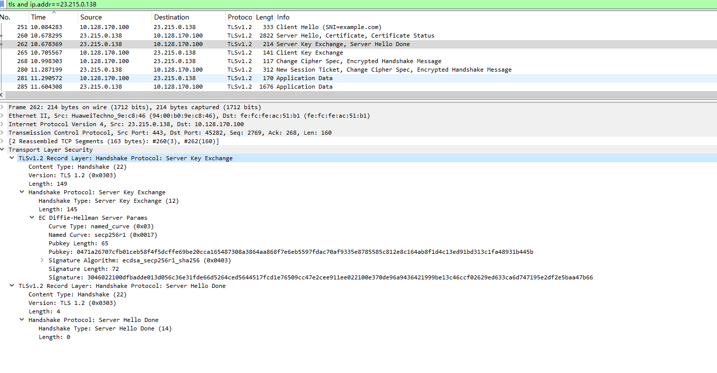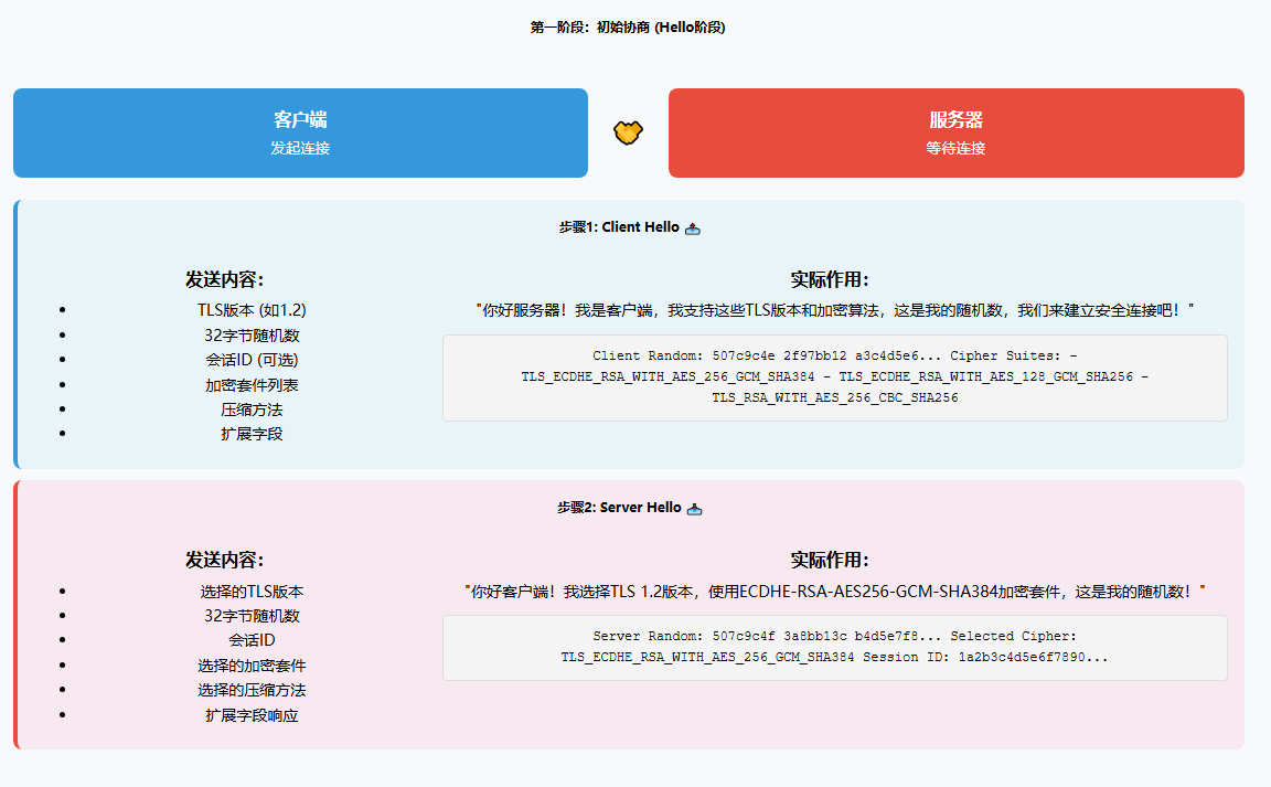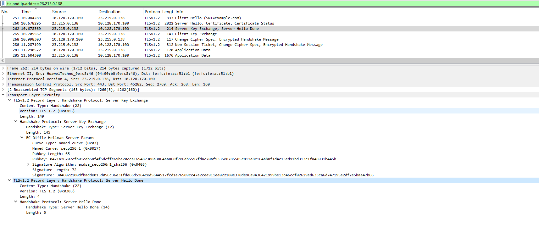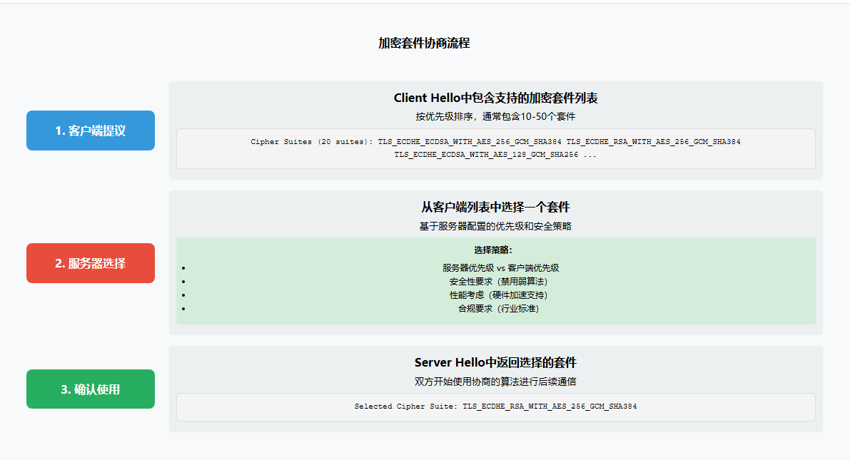作用 **: 服务器从Client Hello提供的108个加密套件中最终选择 的一个。此套件使用:• ECDHE : 椭圆曲线迪菲-赫尔曼密钥交换(提供前向保密性)• ECDSA : 椭圆曲线数字签名算法(用于身份验证)• AES_256_GCM : 256位AES加密,GCM模式(提供加密和认证)• SHA384: 384位SHA哈希算法(用于完整性校验)** | |