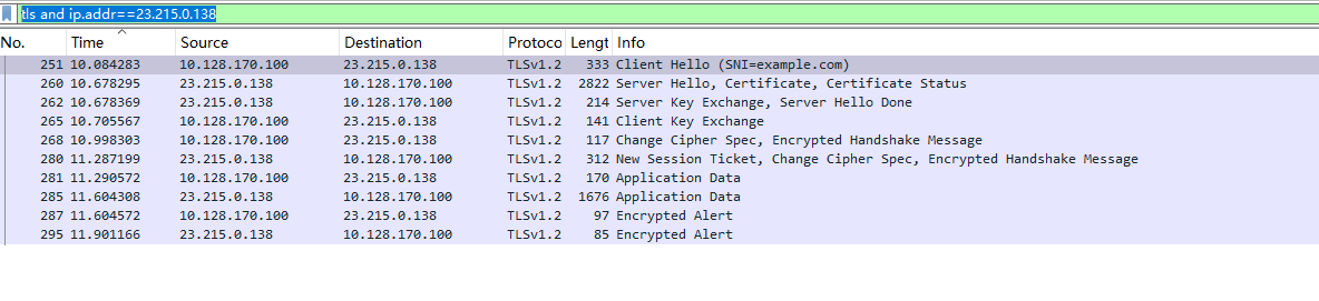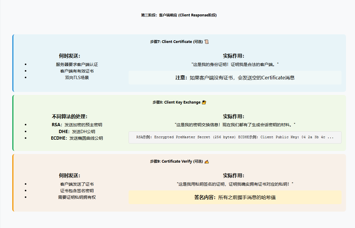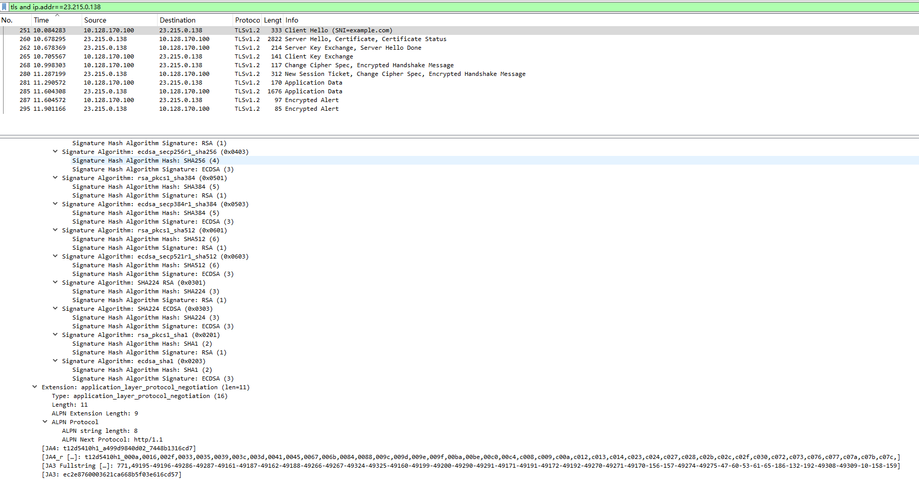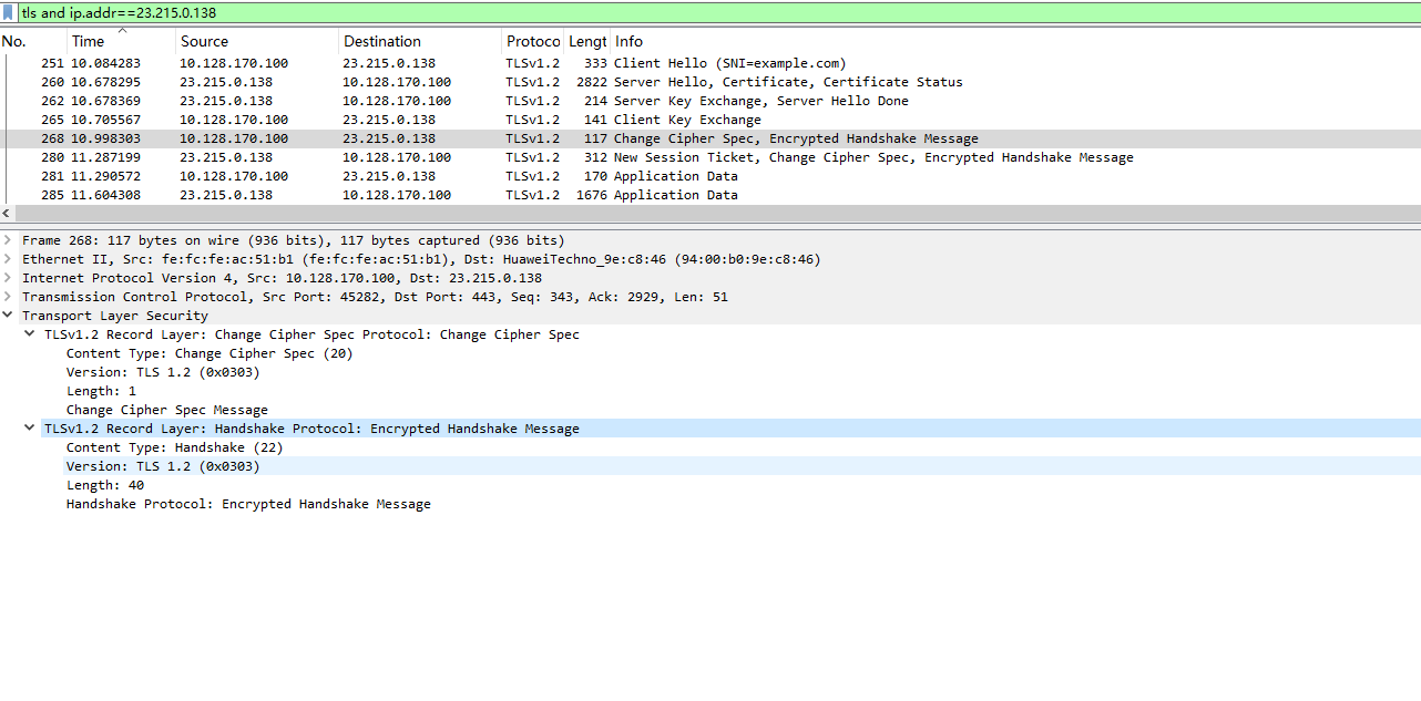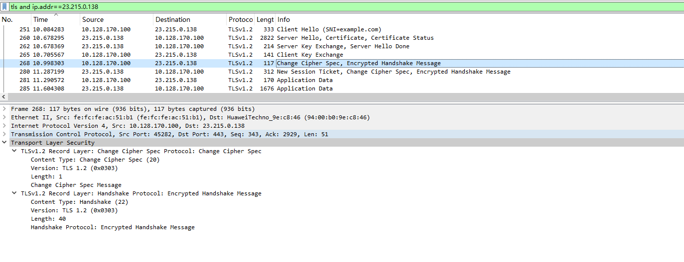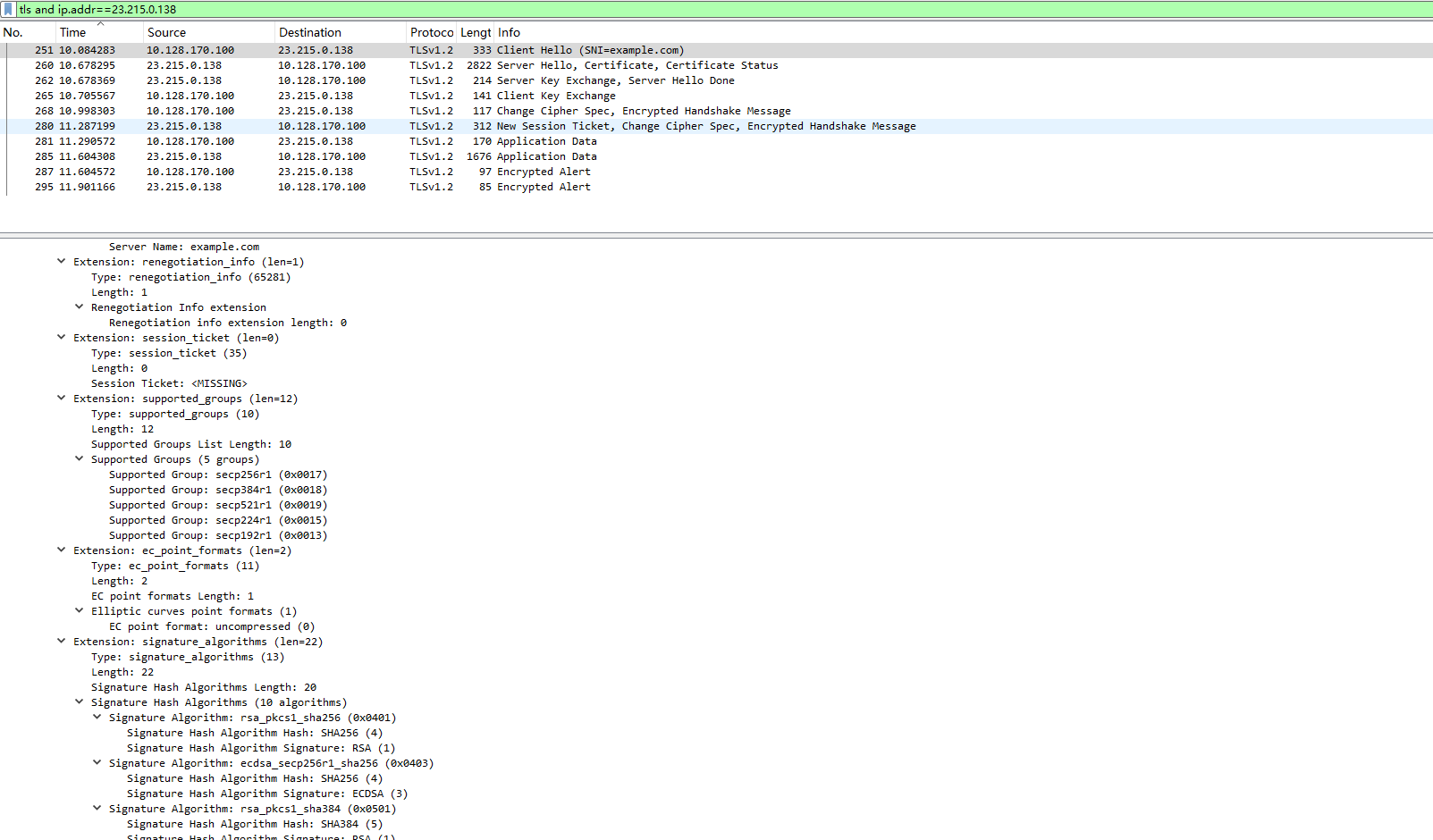 作用 **: 服务器从Client Hello提供的108个加密套件中最终选择 的一个。此套件使用:• ECDHE : 椭圆曲线迪菲-赫尔曼密钥交换(提供前向保密性)• ECDSA : 椭圆曲线数字签名算法(用于身份验证)• AES_256_GCM : 256位AES加密,GCM模式(提供加密和认证)• SHA384: 384位SHA哈希算法(用于完整性校验)** | |