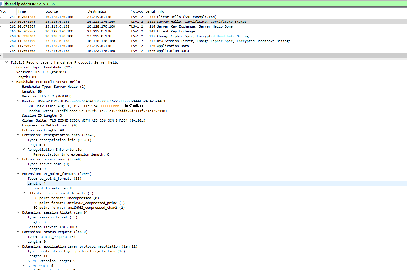 作用 **: 服务器生成的32字节随机数,包含4字节时间戳(GMT Unix Time: Aug 1, 1973)和28字节随机数。与客户端随机数一起,构成后续生成对称会话密钥的关键材料。注意: 显示的时间戳异常(1973年)可能表明服务器故意使用随机值而非真实时间。** | |