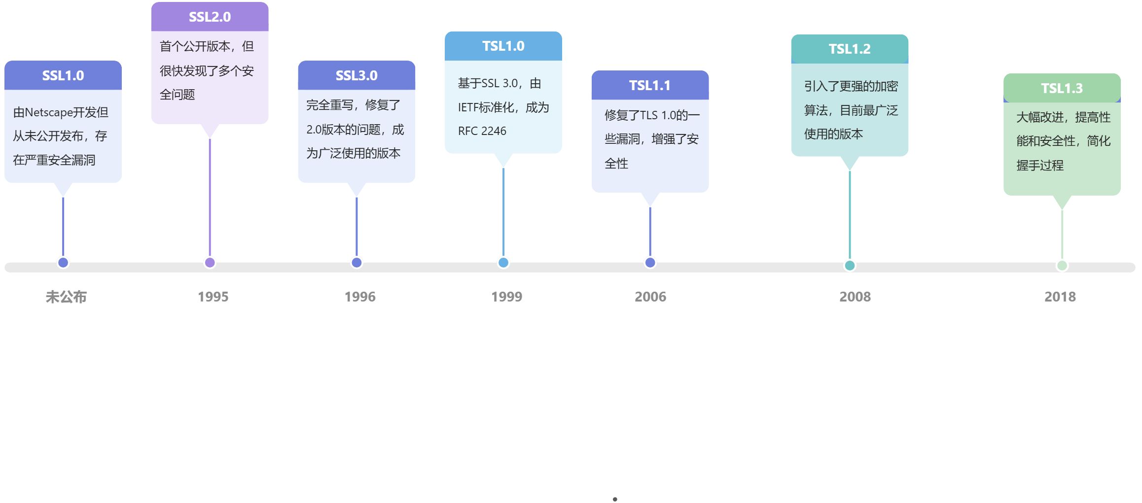 TLS的发展历史可以追溯到其前身SSL,经过多年的发展演变,现在主流使用的版本大多是TLS1.2和TLS1.3,旧版本存在很大安全性,逐渐被弃用。