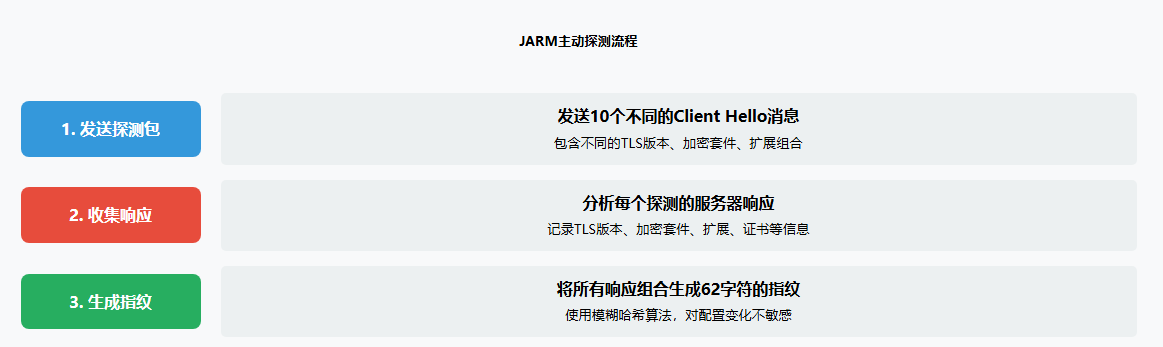 JARM示例: 2ad2ad0002ad2ad00042d42d00000ad9b05a6a0b5a6a0b5a6a0b5a6a0b5a6a0b (62字符模糊哈希)