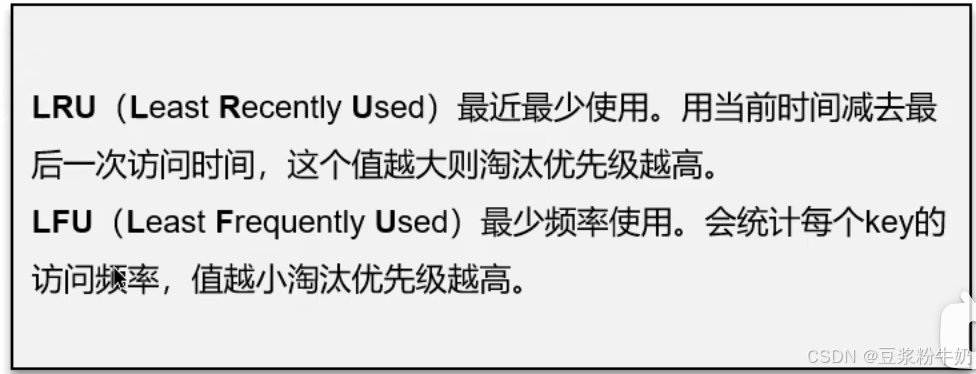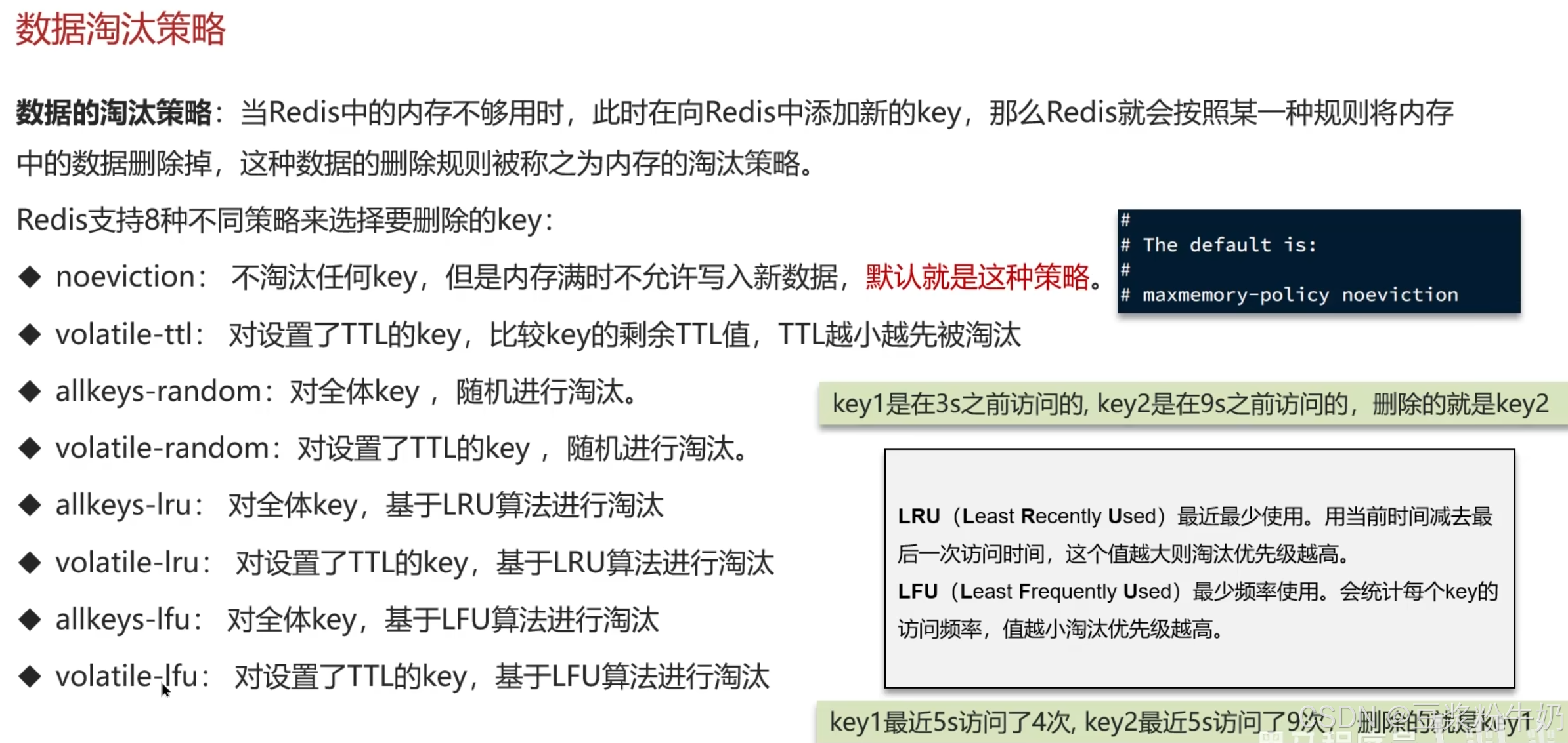 数据淘汰策略:当redis内存不够用时,此时redis在向内存添加新的key时,那么redis就会按照某一种规则将内存中的数据删除掉,这种数据的删除规则被称为内存的淘汰策略。