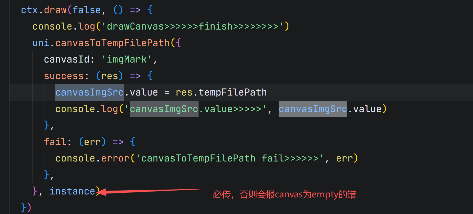 console.error('canvasToTempFilePath fail>>>>>>', err)