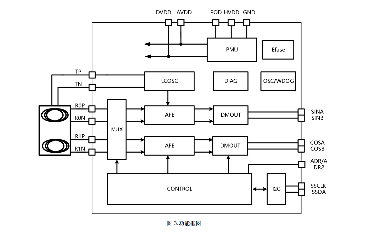供电单元 PMU 集成了偏置电压、偏置电流和两路 LDO,AVDD 和 DVDD。LDO 可选择 3.3V 或4.5V 输出。HVDD 的电压典型值是 5V,耐压高达 15V。PMU 还集成了检测 HVDD 的过压检测、欠压检测功能,以及过热检测功能。