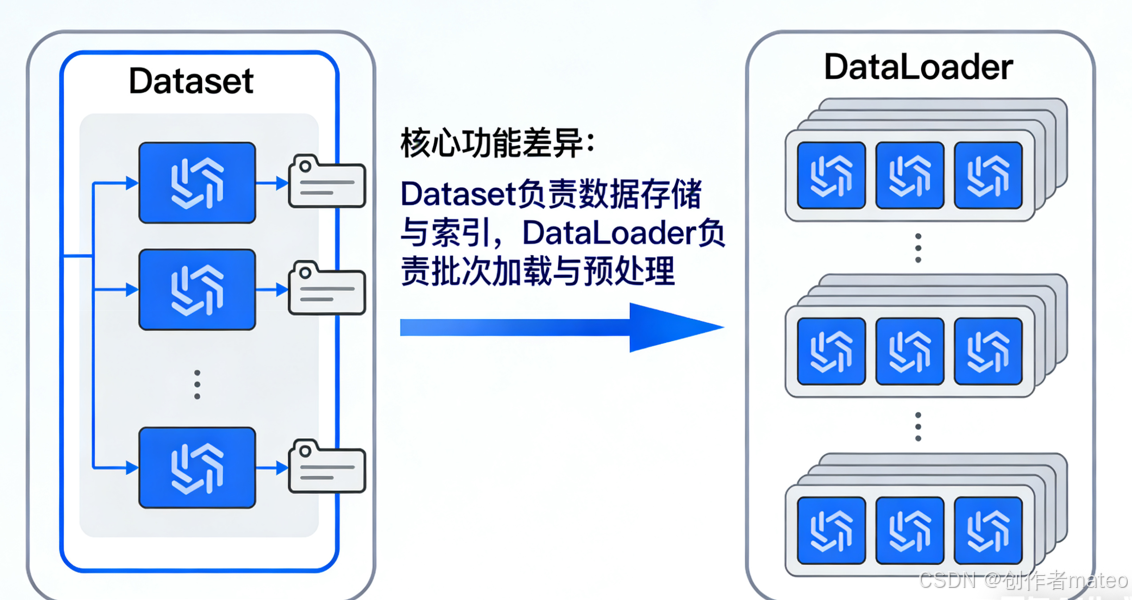 Dataset与DataLoader关系示意图,展示 Dataset 存储数据、DataLoader 按批次读取并打乱的逻辑。
