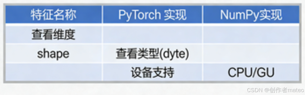PyTorch 的张量操作与 NumPy 的数组操作高度相似,二者核心属性的对应关系如下,便于熟悉 NumPy 的开发者快速上手 PyTorch:
