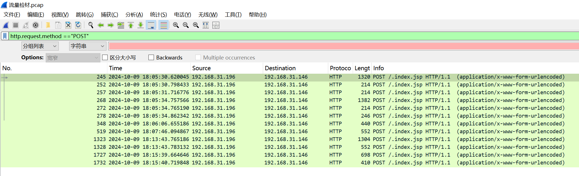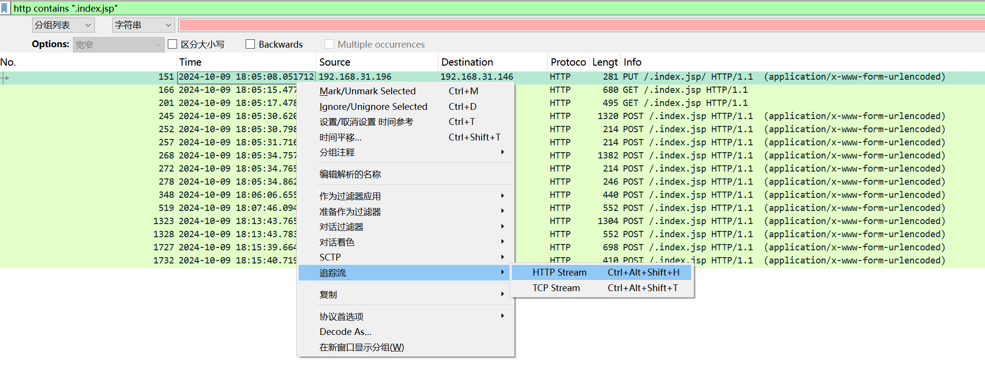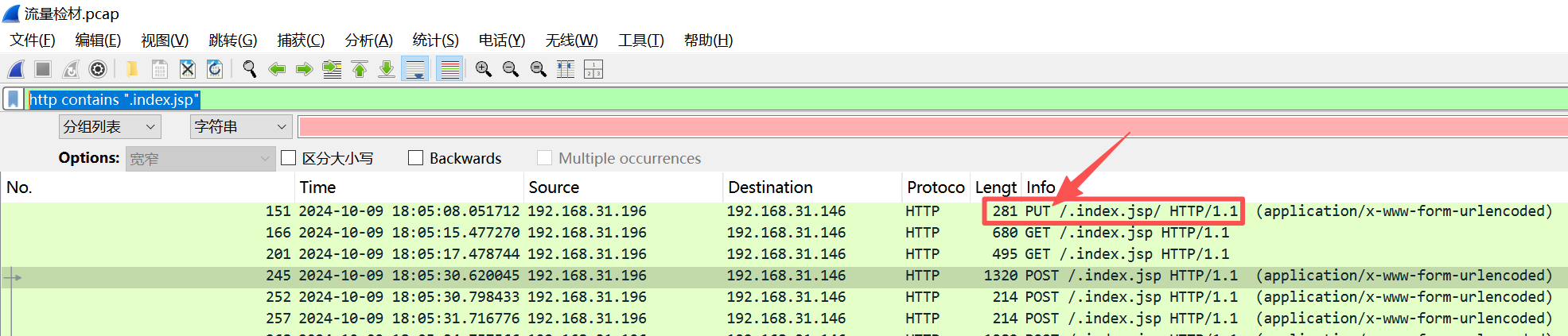 看到了访问一个/.index.jsp 的URL比较可疑。我们继续使用过滤条件http contains ".index.jsp",筛选出所有 HTTP 协议的数据包中,内容包含 ".index.jsp" 这个字符串的流量。