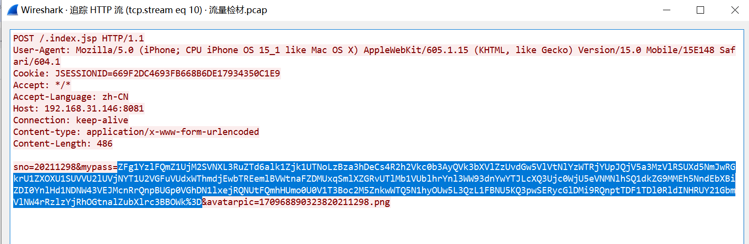 这个时候就要找传给mypass的值是多少。通过追踪流可以看到mypass的值,将其进行解密。