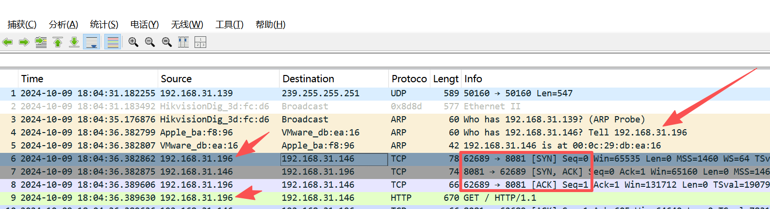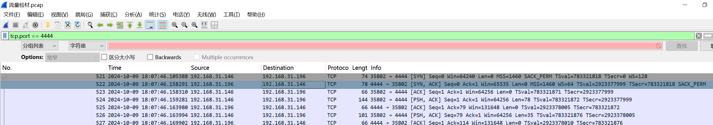 可以看到,根据框起来的部分,是经典的TCP三次握手,可以看到192.168.31.196作为客服端,192.168.31.146作为服务端。所以可以基本看出192.168.31.196作为攻击机,192.168.31.146作为被攻击机。