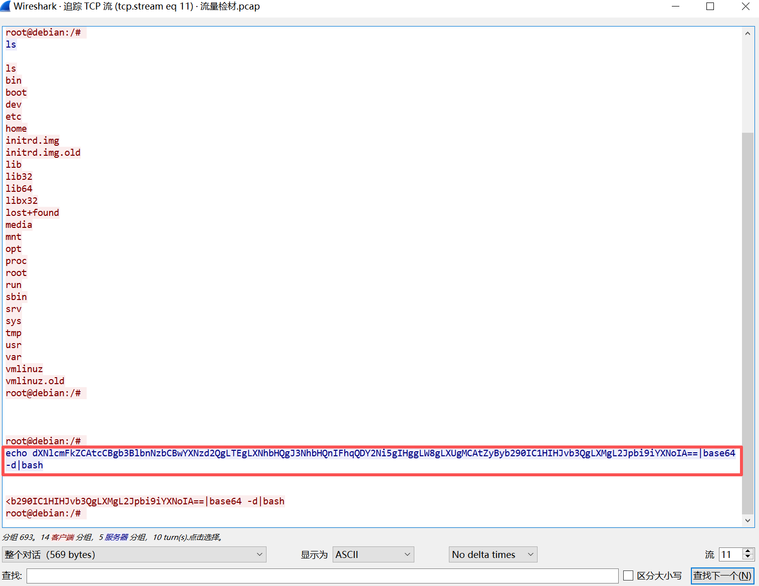 填空题59.请分析流量检材,找出黑客通过后门反连执行的第一条命令是什么?(答案格式:ifconfig)流量分析