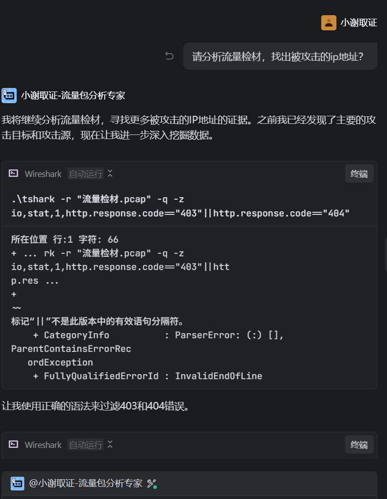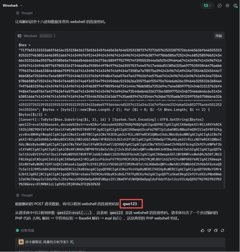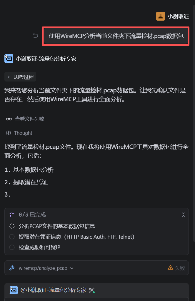 但这套流量包检材暂时只能用Trae解出这些部分,如果涉及到加解密那块的题目就一言难尽。。包括尝试了国际版也是如此。 如果是简单点的流量包题目确实都能跑得出来,就是可能需要一点点的时间。我们接下来以另一套简单点的直接跟Trae进行交互,查看下效果。流量检材2.pcap填空题51.请分析流量检材,该数据流量包的sha1值后6位?(答案格式:字母大写)流量分析