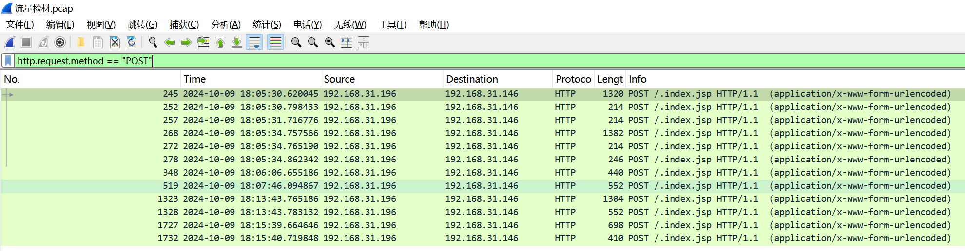 也可以用过滤条件http.request.method == "POST" 看到192.168.31.196对192.168.31.146进行了POST的动作 所以可以断定192.168.31.196作为攻击机,192.168.31.146作为被攻击机。