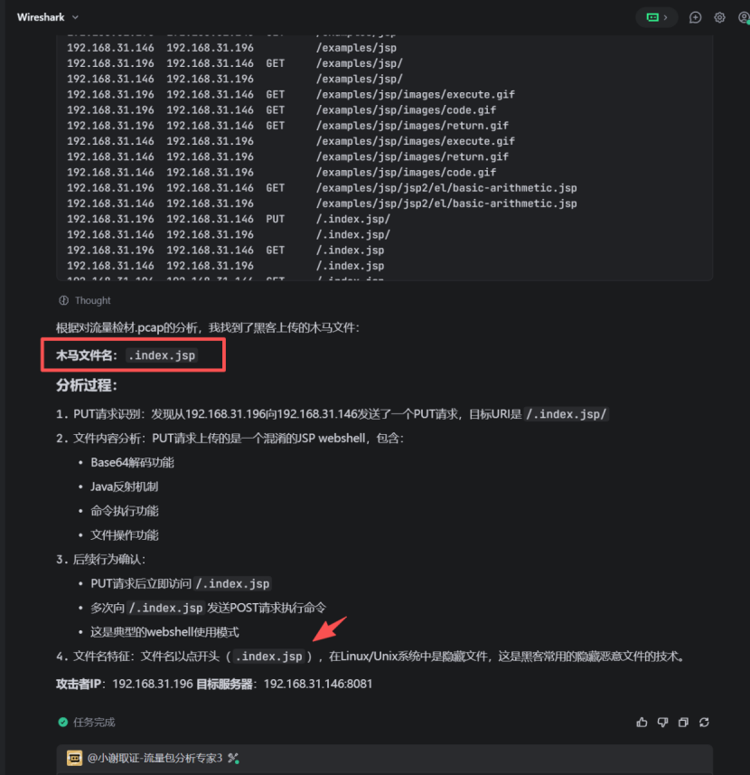 可以看到HTTP 的PUT方法是将请求体内容写入到 "请求 URI 对应的资源",这条日志里的请求 URI 是/.index.jsp/,对应的就是服务器上要被写入(即上传)的文件,名称就是.index.jsp。