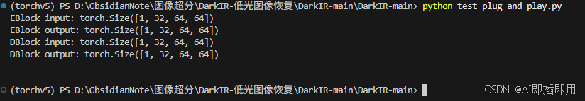 将上述代码保存并运行。可以看到模块成功处理了 (1, 32, 64, 64) 的输入,且输出尺寸保持不变,证明了其即插即用的特性。