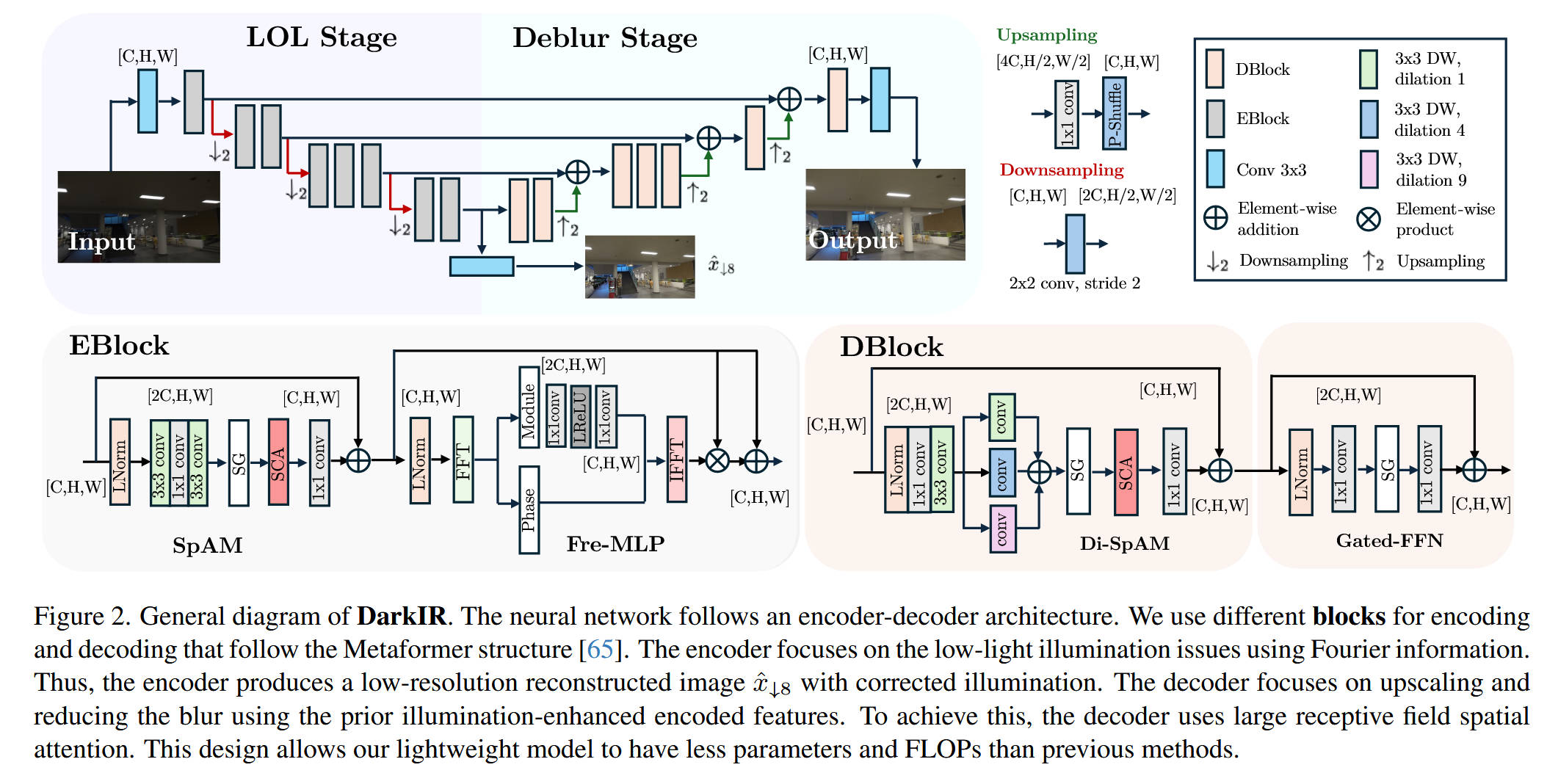 - DarkIR 的解决方案: 提出了一种多任务低光照图像恢复网络,通过在频域 处理光照信息,在空域处理模糊信息,实现了端到端的高效恢复。