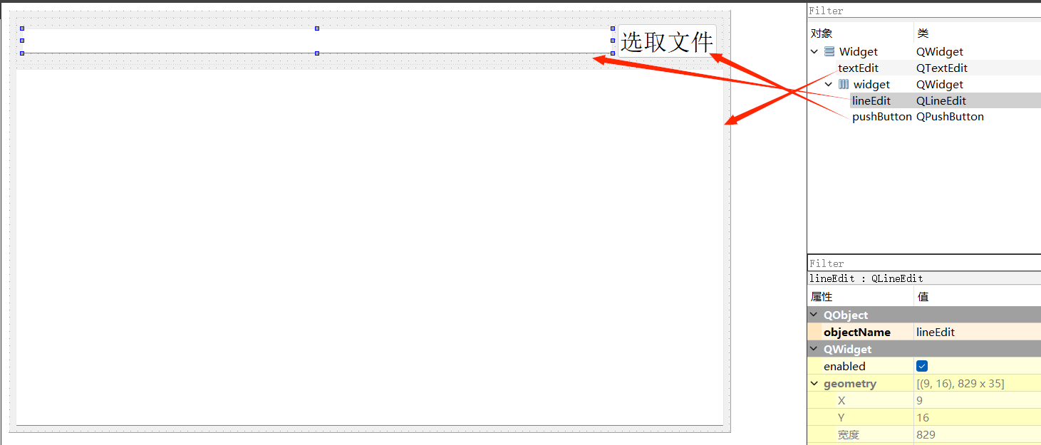 QLineEdit:显示文件路径;QPushButton:选择文件;QTextEdit:显示文件详细信息;- 布局:垂直布局,确保界面整洁。