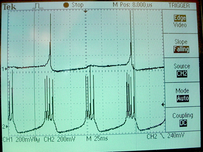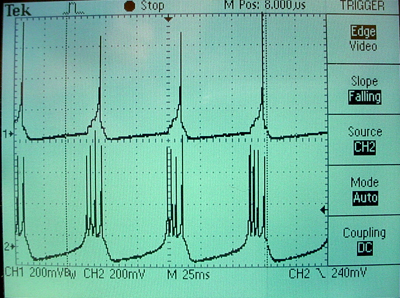 下图展示了初始的非同步电压(底部为神经元 1,顶部为神经元 3)、中间状态以及由上方 Verilog 模块生成的最终收敛状态。初始状态下,两个神经元均处于自发活动状态,但彼此之间的突触连接权重为零。通过调整赫布突触,在几千次脉冲后,神经元之间的耦合逐渐建立。在中间状态下,可以看到神经元 1 的每隔一次脉冲都会触发神经元 3 的一个脉冲,同时也可以看到由阈下耦合产生的微小电压。最终的平衡状态显示,神经元 1 的每次脉冲都会触发神经元 3 的一个脉冲。