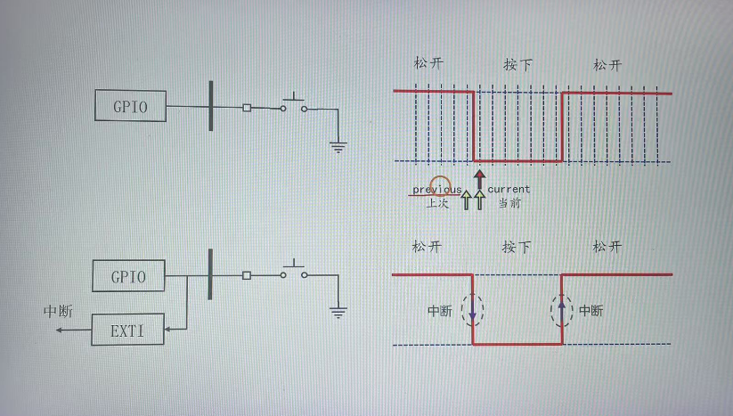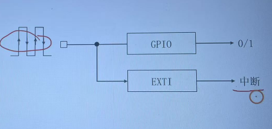 • 而EXTI作用:可以检测GPIO引脚上的电压变化(可以用来边沿检测),可以检测上升沿或者下降沿,上升沿是由低电压变为高电压,下降沿是由高电压变为低电压。