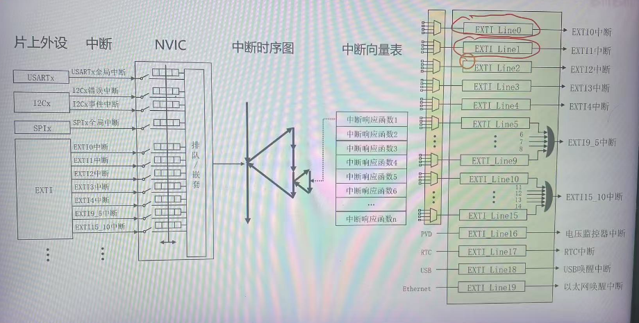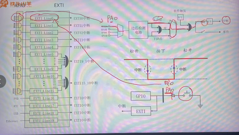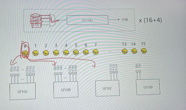 • 这里的线的意思是EXTI线,EXTI一共有20条EXTI线,其中前16条EXTI线是在GPIO中挑选的。根据上图,从每组GPIO里面挑选出一个EXTI线。