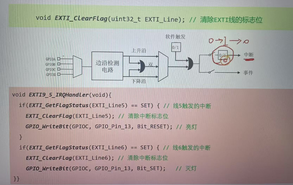 • 清除EXTI线的标志位,不然会一直发生中断。