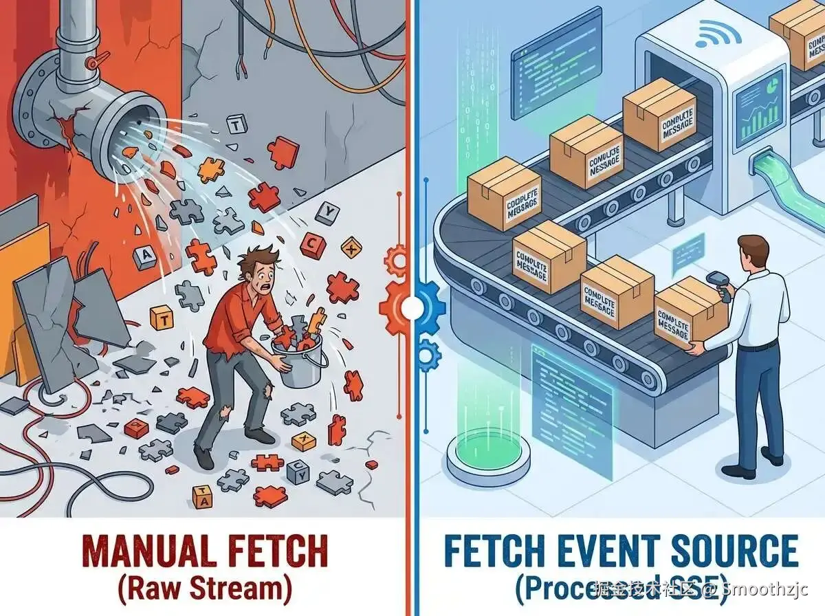 fetchEventSource 这个库,就像一个懂行的私人秘书 。 它虽然底层也用 fetch,但它在中间多做了一层关键工作:缓存与拼接。