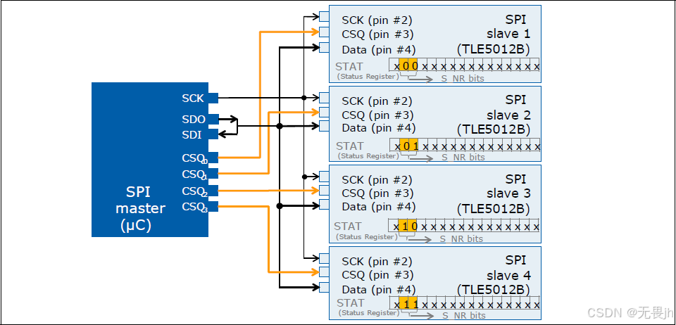 最多有四个从机连接到相同的总线,SPI主机需要四个CSQ管脚连接到每个从机(不能使用菊花链模式)