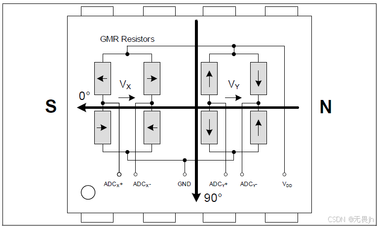 对于施加磁场的两个分量,每个分量都有四个单独的GMR元件连接到一个惠斯通传感器电桥:X分量,Vx(余弦);Y分量,Vy(正弦)。采用全桥结构,可以获得最大的GMR信号,并且温度效应会互相抵消。