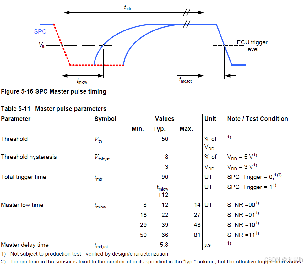 SPC传输由IFA管脚上的主触发脉冲启动,为了检测IFA管脚的低电平,电压必须低于阈值电压Vth,传感器一检测到IFA线被释放,Vth就被穿过了。