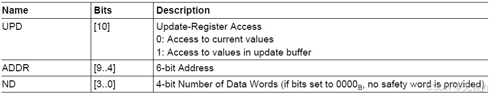 9.如果在命令字中数据的数量为零(ND=0),则读取ADDR给出的地址处的寄存器,但TLE5012B不会发送安全字。这允许快速读取一个寄存器。