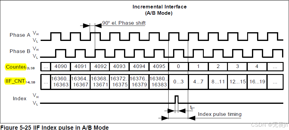 IFC引脚(或IIF索引)在零交叉时生成一个脉冲。 这个输出可以作为检查使用,或者与相位A/相位B输出进行比较。当内部增量接口计数器跨过0°时,将生成IIF索引脉冲。