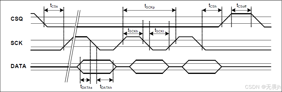 11.在发送安全字之后,传输结束。要开始另一次数据传输,CSQ必须至少在tCSoff时间内被取消选择一次。