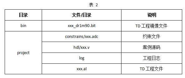 (3)案例位于产品资料"4-软件资料\Demo\FPGA-demos\FPGA-HDL-demos\"目录下。案例包含bin目录和project压缩包,其中bin目录下含有案例可执行镜像文件,project压缩包内包含案例工程文件。案例目录详细说明见下表: