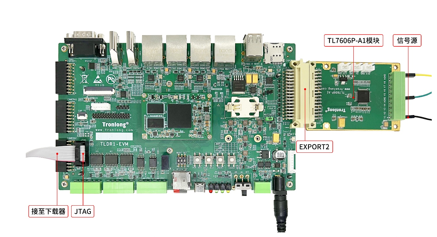 请将TL7606P模块连接至评估板的EXPORT2接口,将TL7606P模块的VX通道正确连接至信号发生器A通道。同时使用下载器连接评估板JTAG接口至PC端USB接口。硬件连接如下图所示。