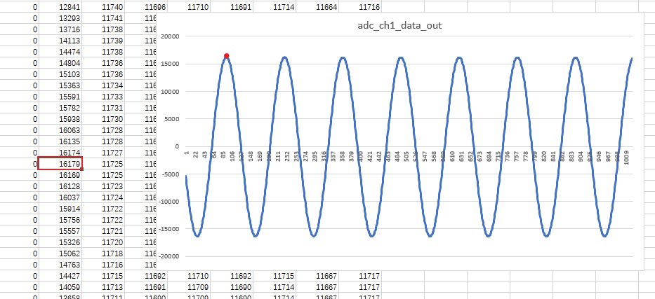 根据以上波峰值和波谷值,套用计算公式:CODE = VIN x VREF / 2n,计算可得约为4.95V,与信号发生器设置峰峰值:5.00Vpp接近。