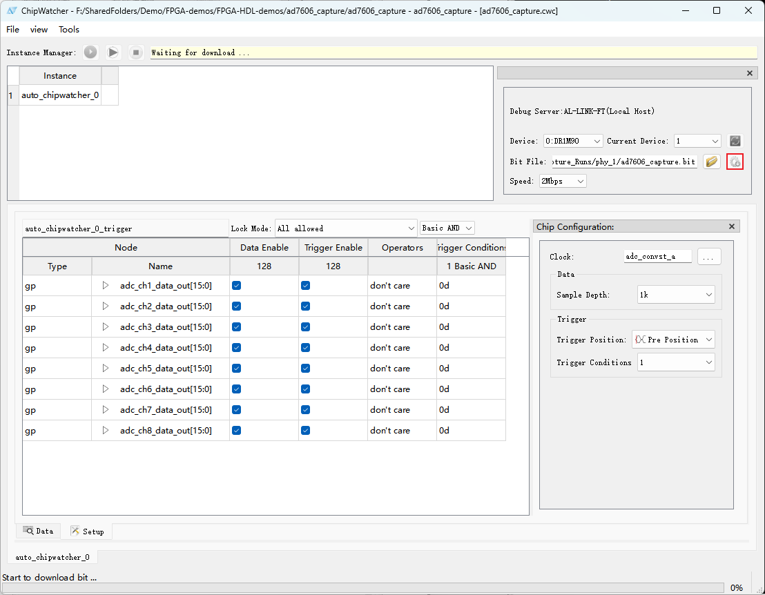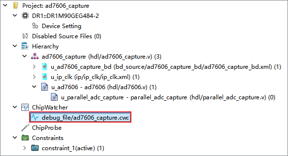 打开案例对应的TD工程,在工程编译成功后,点击"Hierarchy Navigation"栏"ChipWatcher"选项下的.cwc文件。