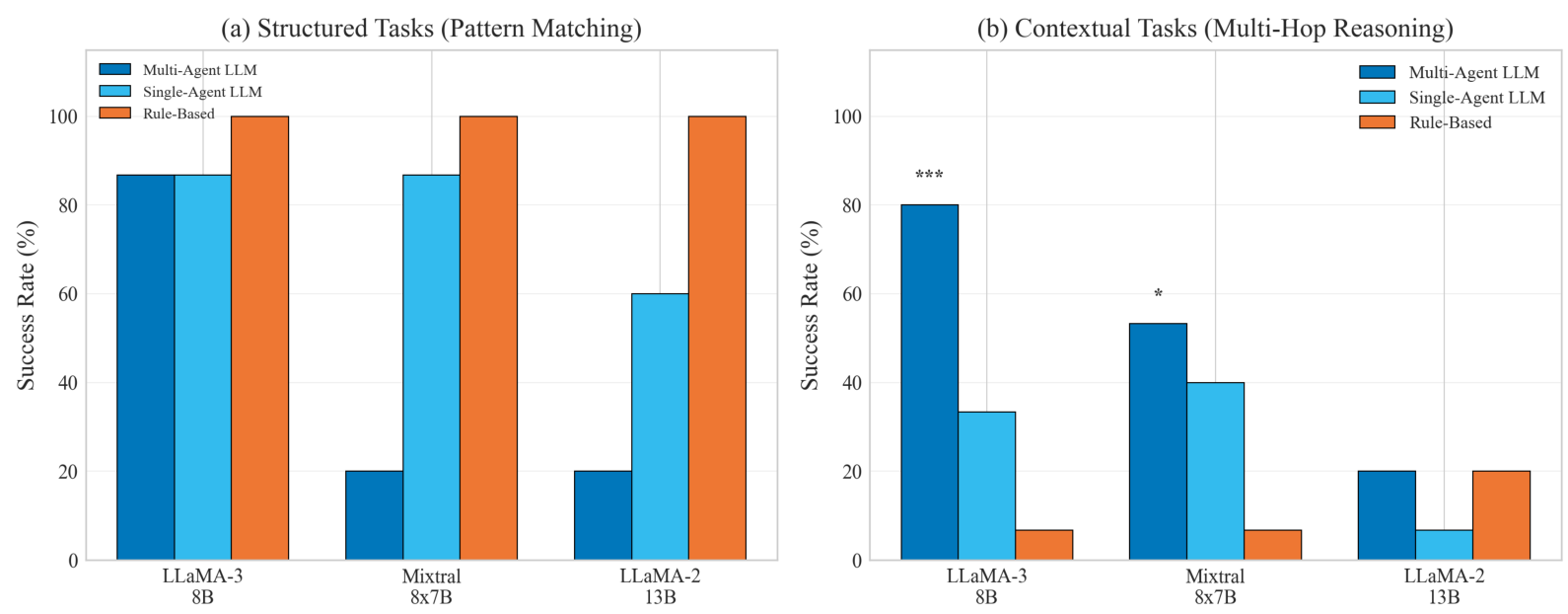 关键观察 。最引人注目的模式是任务-方法分离:基于规则的方法在结构化任务上实现了 100 % 100\% 100% 的成功率,但在上下文推理任务上仅为 6.7 % 6.7\% 6.7%,而 LLM 多智能体系统则显示出相反的模式。对于有能力的模型(LLaMA-3 8B、Mixtral),多智能体协作提供了统计学上显著的改进(分别为 p < 0.001 p < 0.001 p<0.001 和 p = 0.014 p = 0.014 p=0.014),而较弱的模型则没有获益。对这些模式的详细分析将在后续章节中进行。