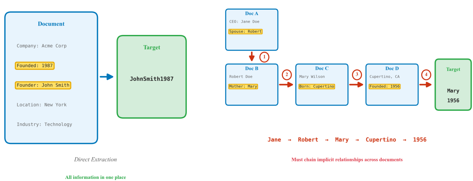 多跳上下文推理是扩展分析中一个特别有趣的案例。与可以通过模式匹配或单步检索解决的任务不同,多跳推理要求模型:(1) 识别分布在上下文中的相关信息片段,(2) 识别这些片段之间隐含的关系,以及 (3) 综合它们以得出任何单一来源中未明确说明的结论。这种能力对于文档理解、科学发现和安全分析等现实世界应用至关重要。