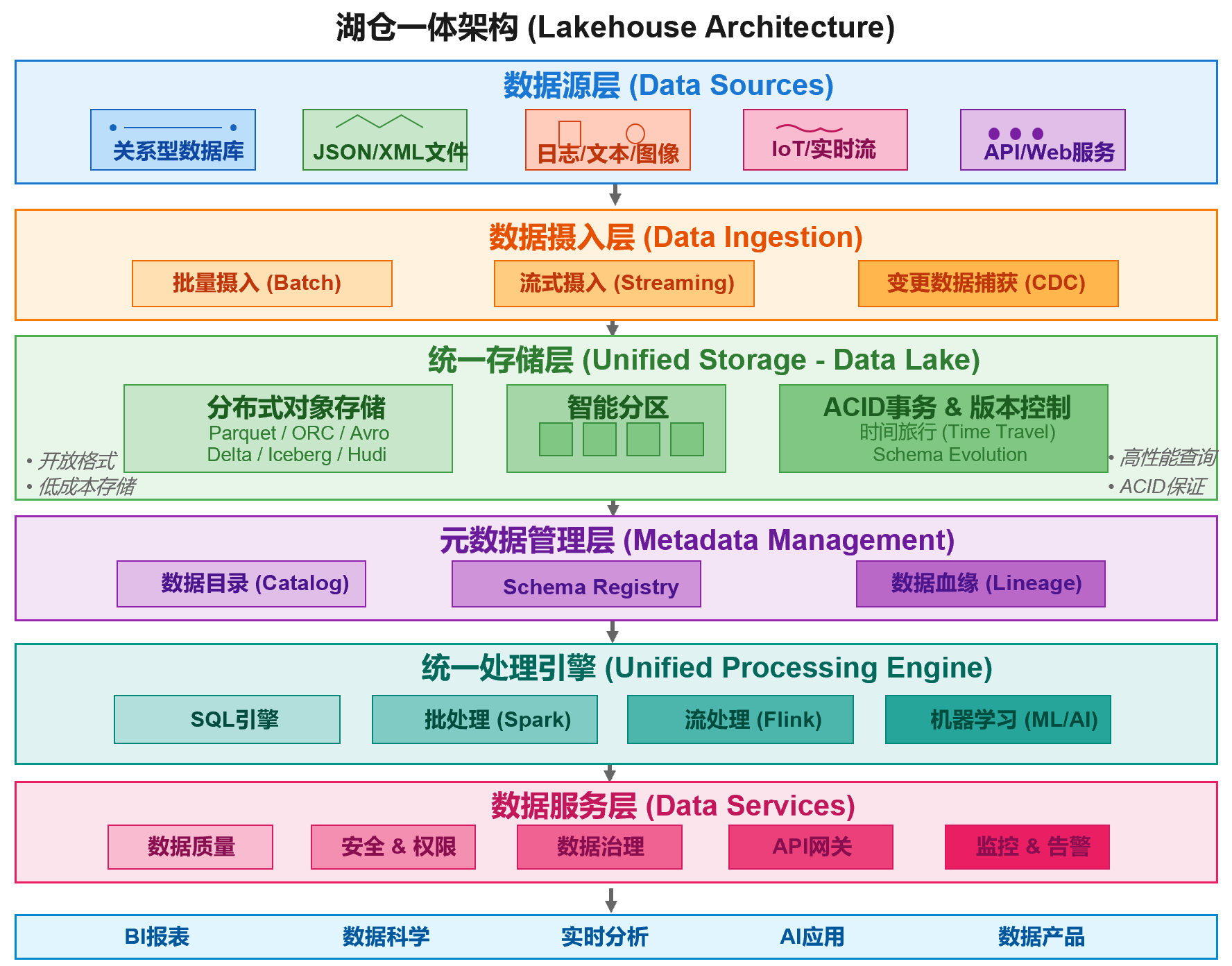 而现在的湖仓一体就像造了一个智能仓储中心,把两个仓库的优点结合起来了!这个智能仓储中心的架构呢,如下所示: